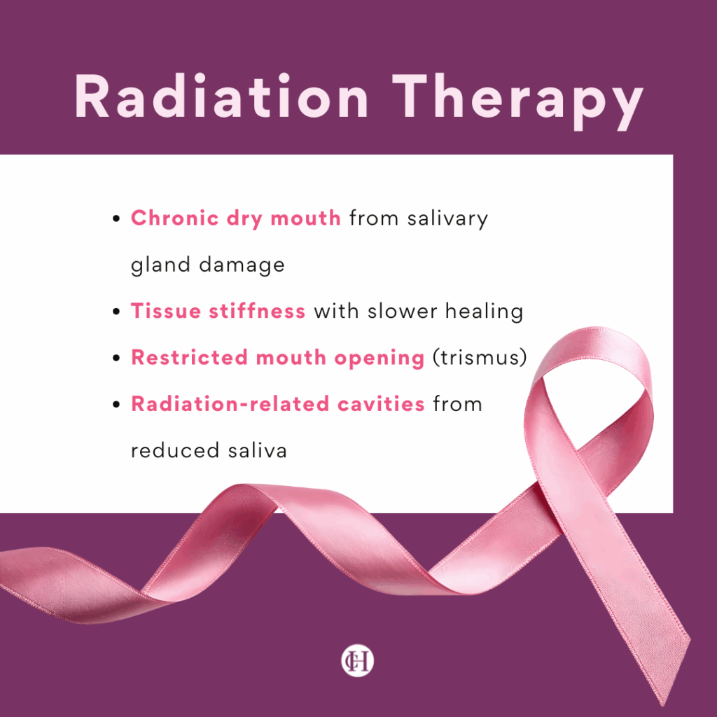 Although breast cancer radiation is usually targeted to the chest, overlapping with the neck or jaw area in rare cases can lead to oral side effects, including: